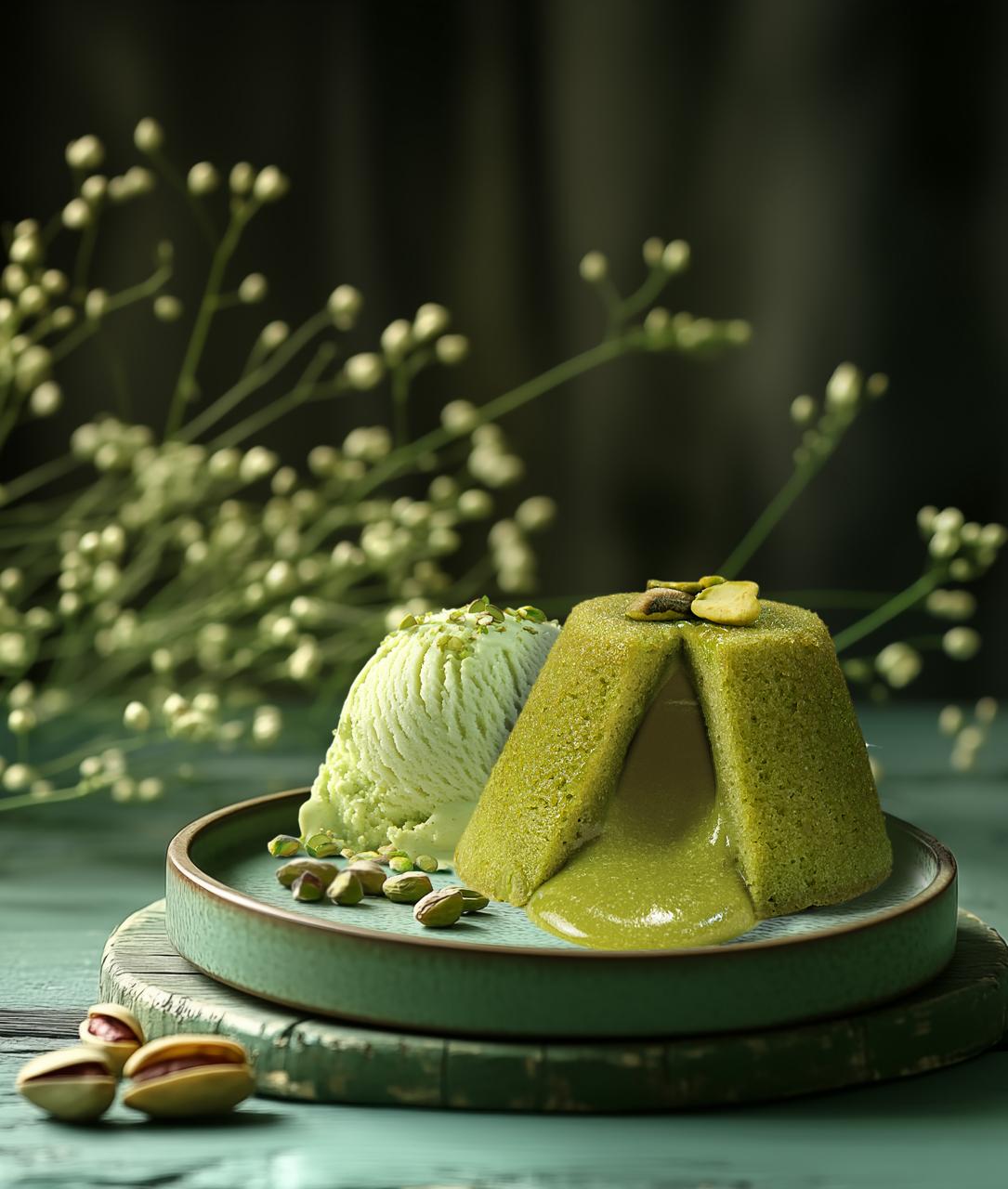 Elegância em cada detalhe: um petit gâteau de pistache com massa macia e interior cremoso, perfeito para ser servido quente com sorvete ou frutas frescas, criando um contraste de sabores e temperaturas.